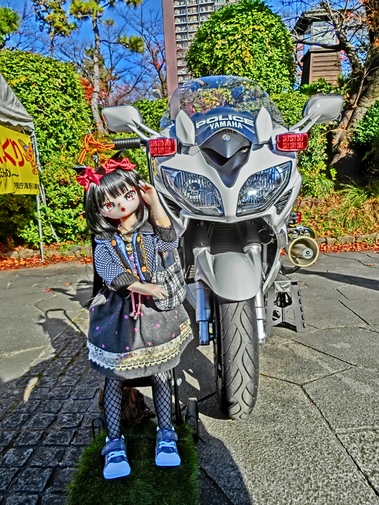噴水広場に移動してきました 今日は子供のイベントがあり家族連れで賑わってます 白バイの前で記念写真